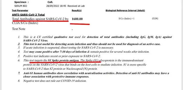 Ένα θετικό τεστ για «αντίσωμα ακίδας S1» μπορεί να προκληθεί από λοίμωξη από Covid, αλλά και από εμβολιασμό. Τα εμβολιασμένα άτομα αναπτύσσουν μια αντίδραση μόνο στην «πρωτεΐνη ακίδας» επειδή αυτό είναι το μόνο μέρος του ιού που παρουσιάζεται στο ανοσοποιητικό σύστημα (και επίσης τυχαίνει να είναι τοξικό με πολλούς τρόπους).