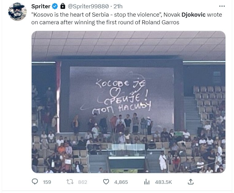 Ο θρύλος του τένις Νόβακ Τζόκοβιτς έκανε μια ανάρτηση δηλώνοντας ότι «το Κόσοβο είναι η καρδιά της Σερβίας» μετά τη νίκη στον πρώτο γύρο επί του Αμερικανού Αλεξάνταρ Κοβάσεβιτς στο Γαλλικό Όπεν τη Δευτέρα, αναφέρει το RT. Νωρίτερα την ίδια μέρα, ξέσπασαν μάχες μεταξύ Σέρβων διαδηλωτών και στρατευμάτων του ΝΑΤΟ στο βόρειο Κοσσυφοπέδιο.