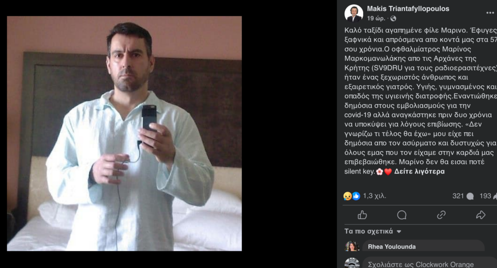 Ο οφθαλμίατρος Μαρίνος Μαρκομανωλάκης απο τις Αρχάνες της Κρήτης (SV9DRU για τους ραδιοερασιτέχνες) ήταν ένας ξεχωριστός άνθρωπος και εξαιρετικός γιατρός.