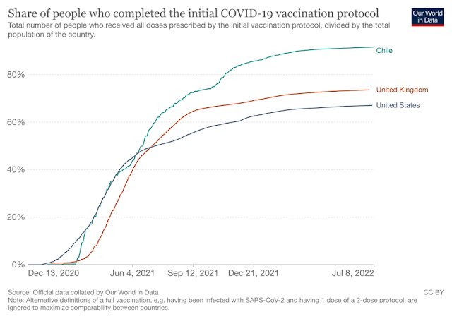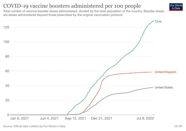 Στη Χιλή, περίπου το 90 τοις εκατό του «εμβολιασμένου» πληθυσμού είναι τρυπημένο κατά του Covid-19. Περισσότεροι από τους μισούς έχουν κάνει ακόμη και το «ενισχυτικό». Και όμως η υπερβολική θνησιμότητα είναι εξαιρετικά υψηλή.